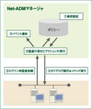 遠隔地にあるサーバの操作支援機能で、複雑なオプションを要するコマンドなどもあらかじめ登録しておくことによってボタン一つで実行可能になります。また、実行結果を保存することで、報告書の作成を支援します。Net-ADMの通信機能を使用しているので、RPCやTELNETなどのプロトコルを禁止している環境でも使用が可能です。